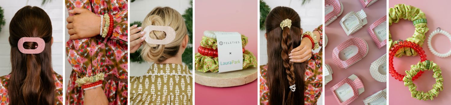 The collection includes Laura Park TELETIES hair ties, silk scrunchies, and both flat round and flat square Laura Park hair clips, all featuring exclusive holiday-themed prints.