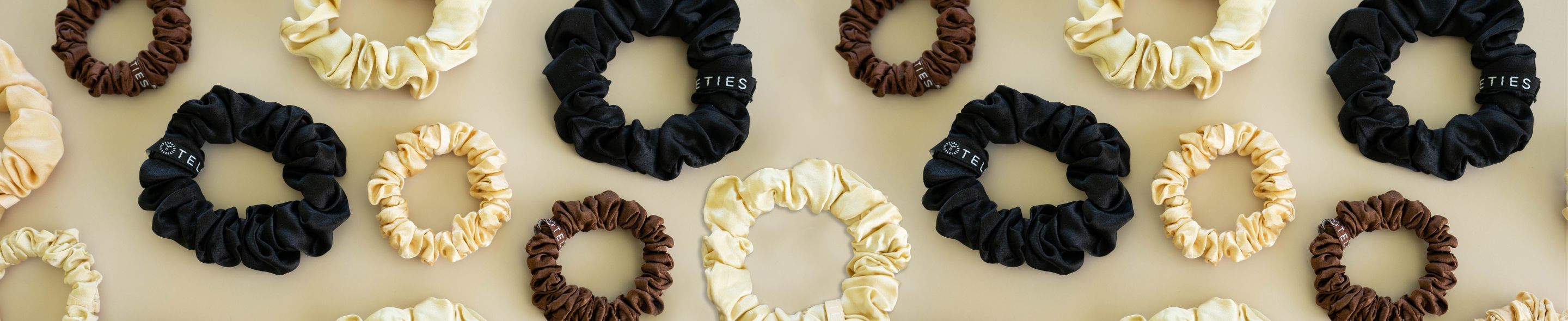 A scrunchie is a fabric-covered hair tie that provides a gentle, stylish way to secure your hair. TELETIES scrunchies is our innovative spiral coil hair tie inside fabric so you get the same features of our game-changing hair ties.