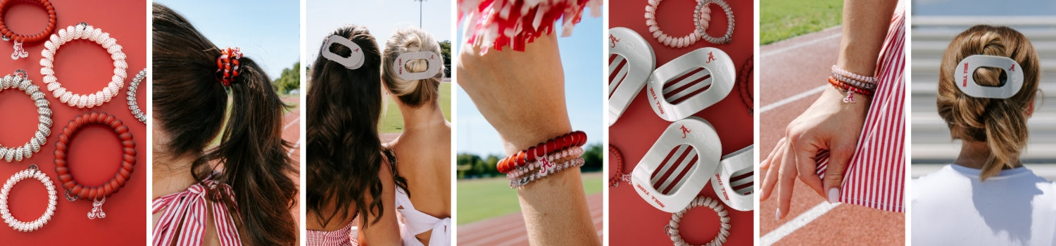Show your University of Alabama school spirit with TELETIES officially licensed college hair accessories. Our University of Alabama Hair Accessories collection features Alabama hair ties, claw clips, and our iconic flat hair clip in orange and navy. Shop now and cheer on your team in style! Roll Tide!