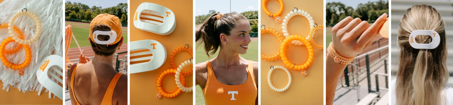 Show your University of Tennessee school spirit with TELETIES officially licensed college hair accessories. Our University of Tennessee Hair Accessories collection features Tennessee hair ties, claw clips, and our iconic flat hair clip in white and orange. Shop now and cheer on your team in style! Go Vols!