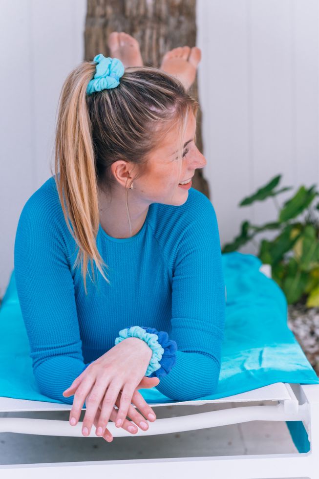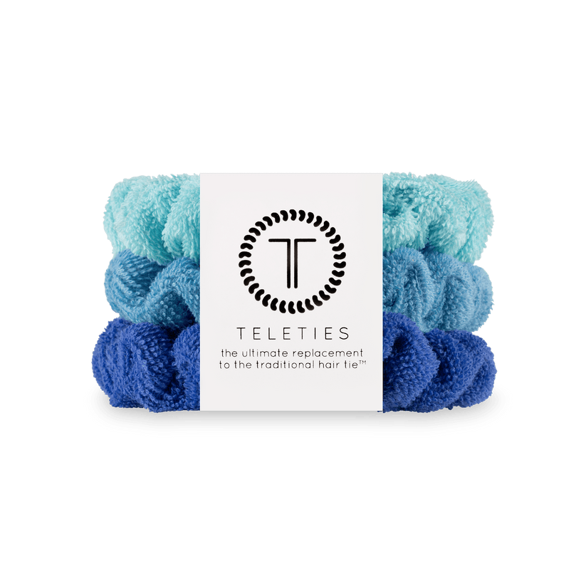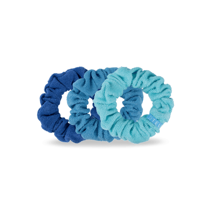 Hold your hair in place with ease and softness! Bora Bora Large Towel Scrunchies in Blue offer a secure grip without slipping—thanks to the innovative inner coil—wrapped in soft, terry cloth fabric.