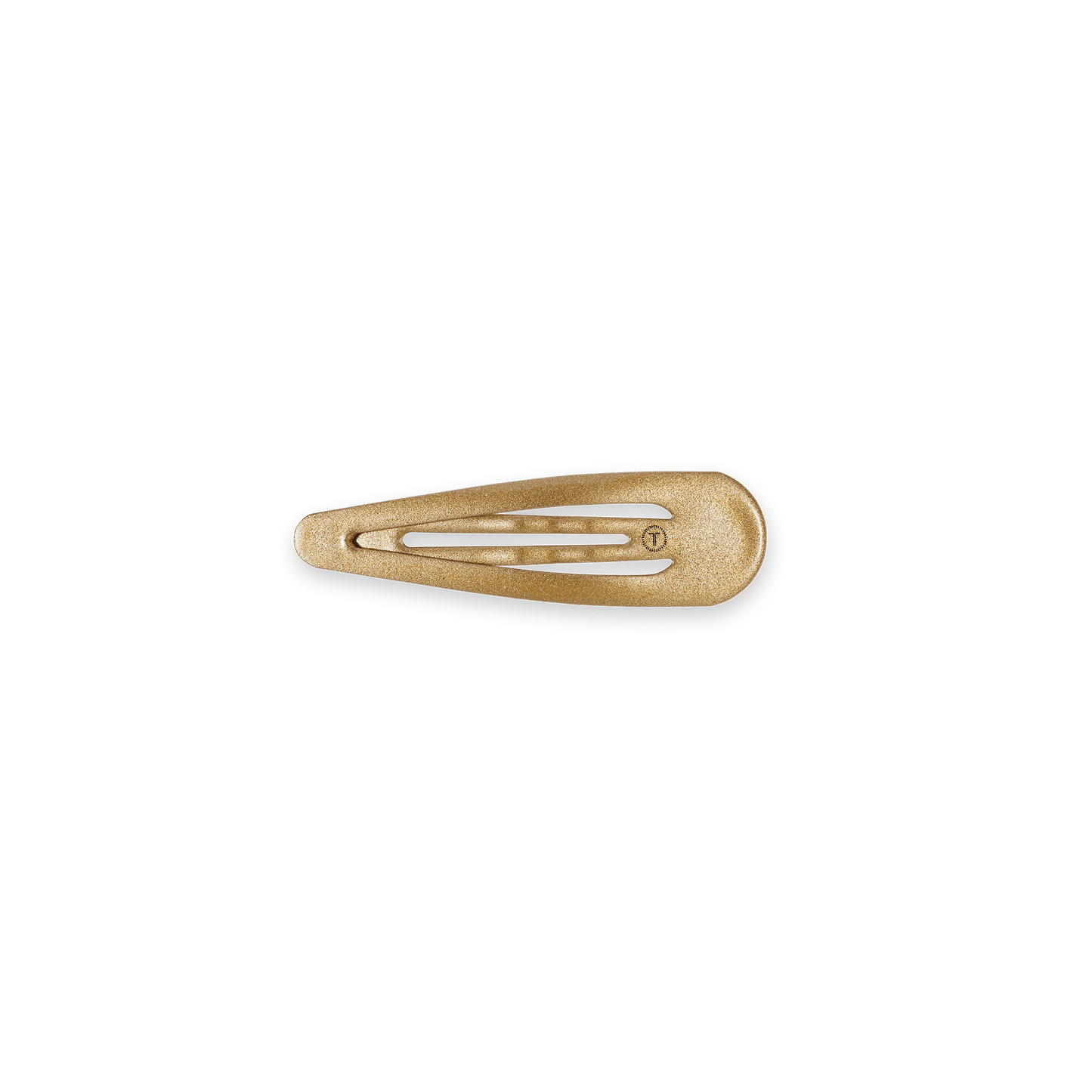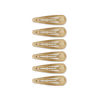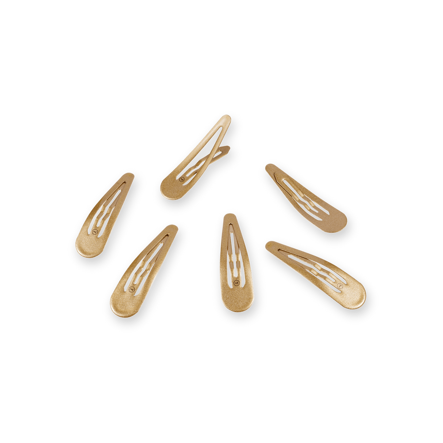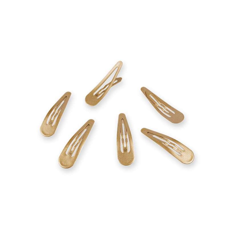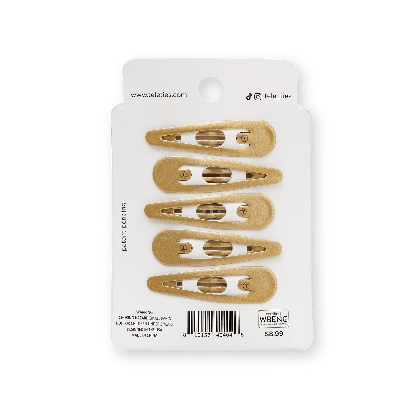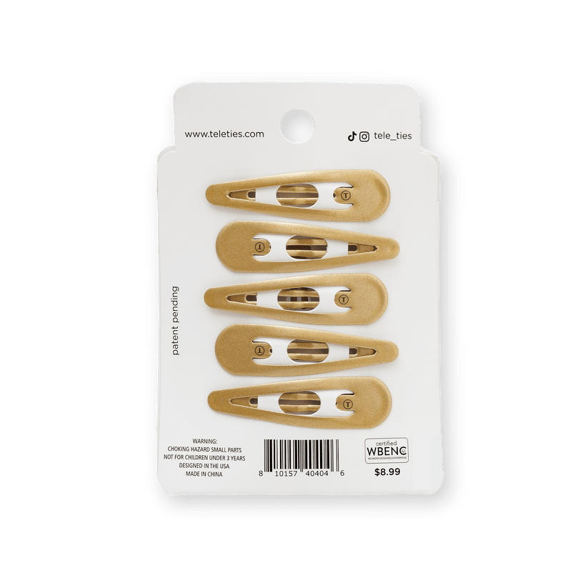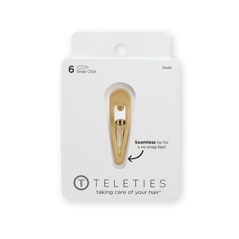 TELETIES Gold Snap Clips (6Ct) in Gold offer a secure seamless tip for a no snag feel. Perfect for all hair types, these stylish barrettes provide a gentle yet firm hold, whether you're styling or simply pulling back strands. Available in a range of colors, TELETIES Snap Clips combine functionality with flair, ensuring your hair stays put all day long.