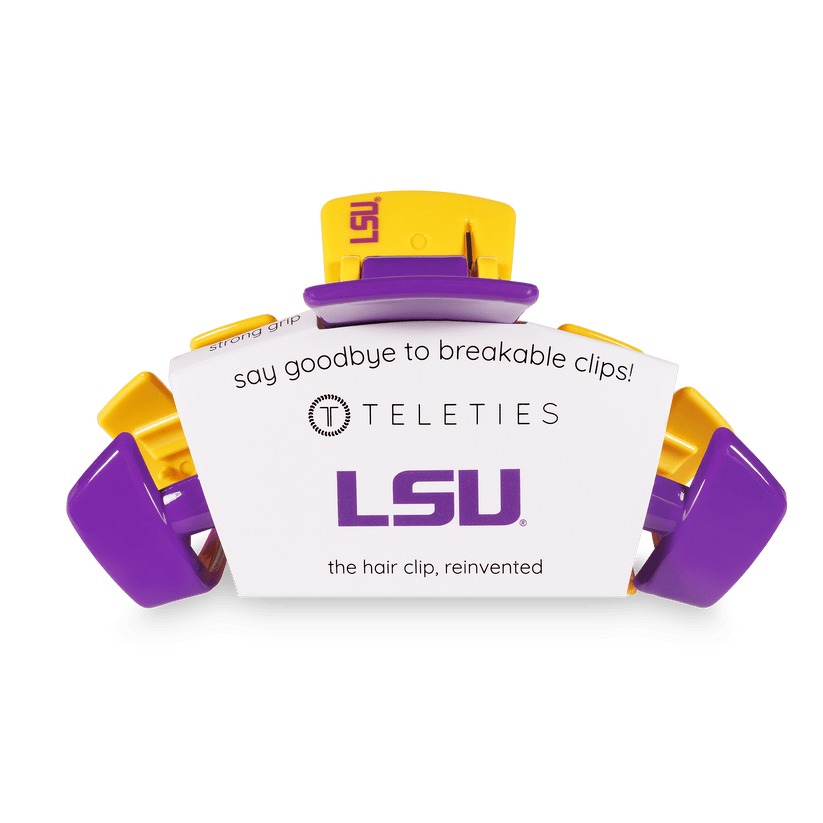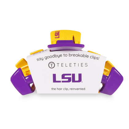 Say goodbye to breakable hair clips! We have perfected the hair tie and now have re-invented the clip. Meet the LSU Large Claw Hair Clip in Purple White Yellow, crafted to elevate any hairstyle with the ideal blend of style and function.