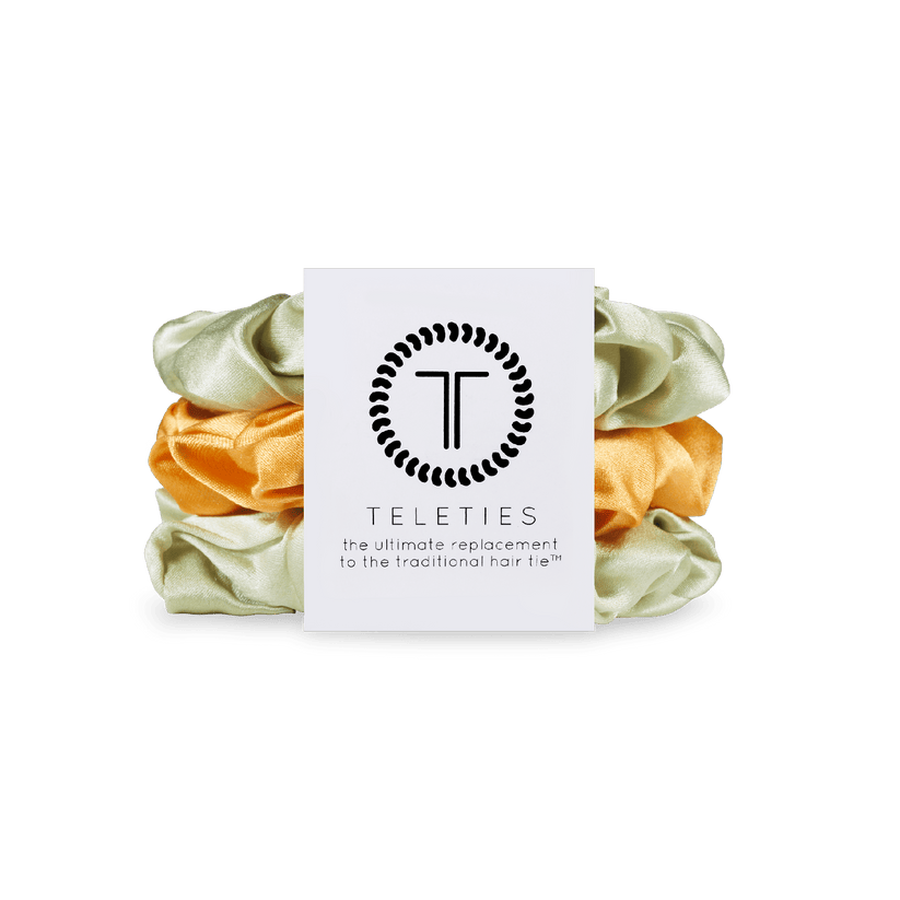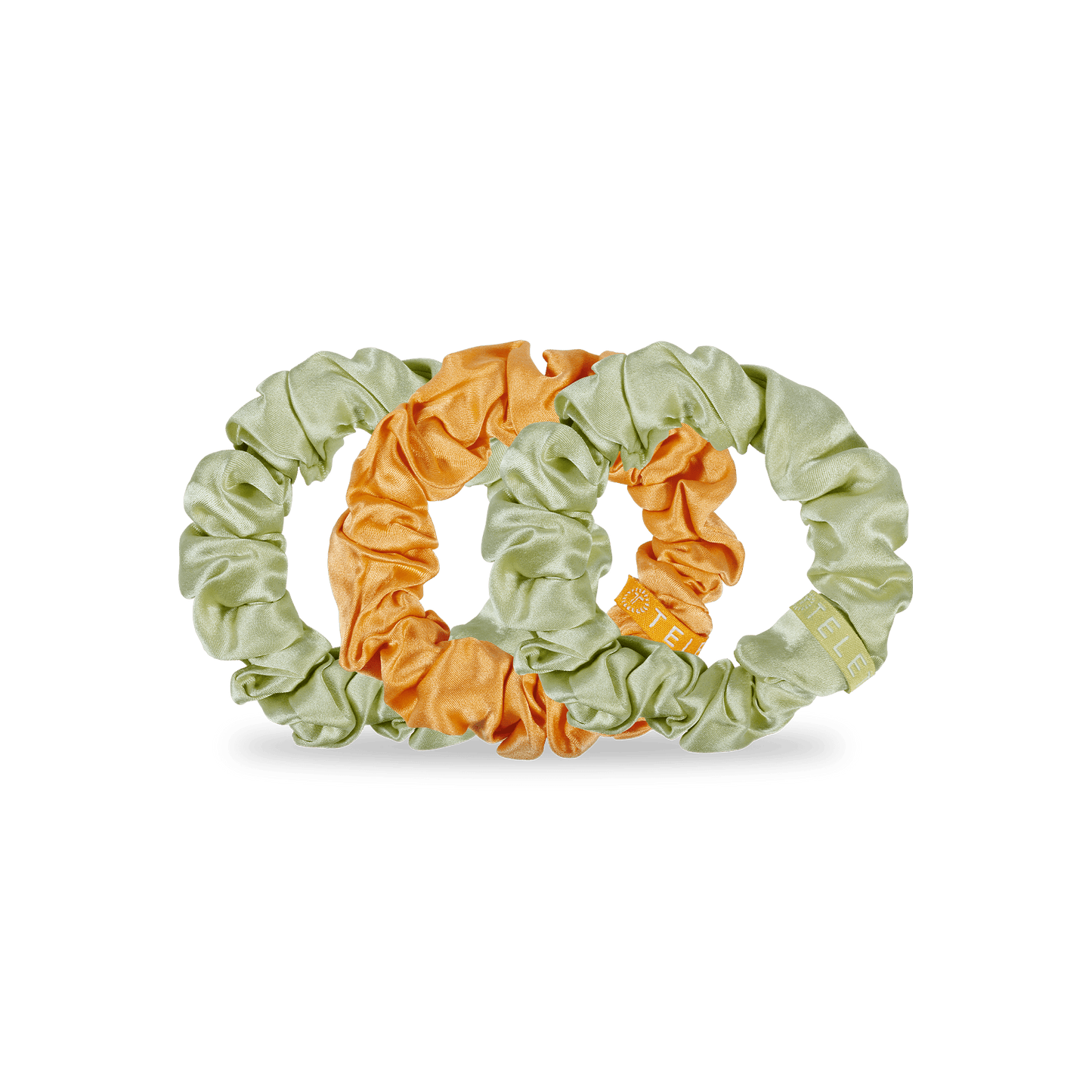 We are taking care of your hair, even while you sleep! Our new silk scrunchies are the perfect product for your bedtime routine. The TELETIES Silk scrunchies are made of 100% natural Silk, making them super soft and gentle on your hair. It also prevents breakage and damage while you snooze. With our innovative spiral coil inside, you get the same features of our game- changing hair ties now covered in silk, so you will wake up with hip, happy and healthy hair!
