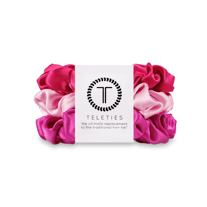 We are taking care of your hair, even while you sleep! Our new silk scrunchies are the perfect product for your bedtime routine. The TELETIES Silk scrunchies are made of 100% natural Silk, making them super soft and gentle on your hair. It also prevents breakage and damage while you snooze. With our innovative spiral coil inside, you get the same features of our game- changing hair ties now covered in silk, so you will wake up with hip, happy and healthy hair!