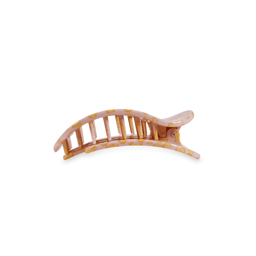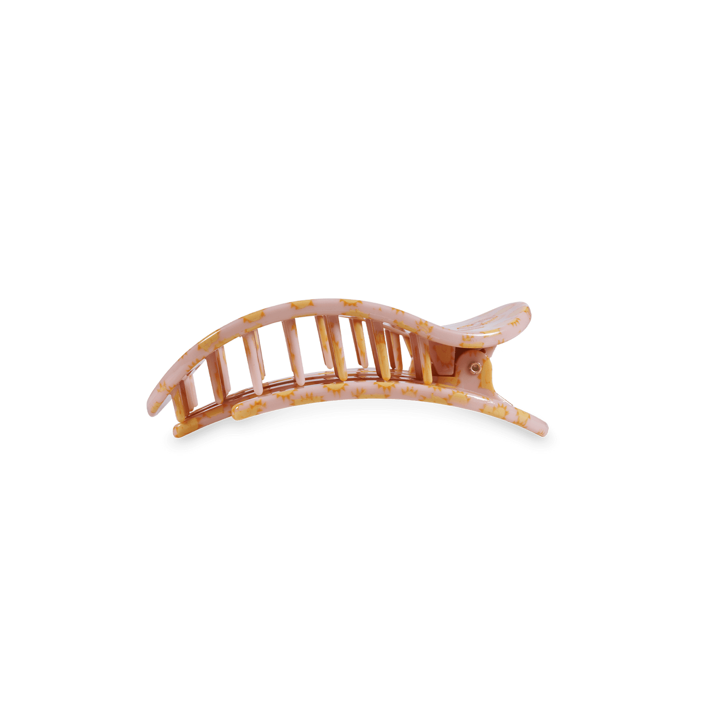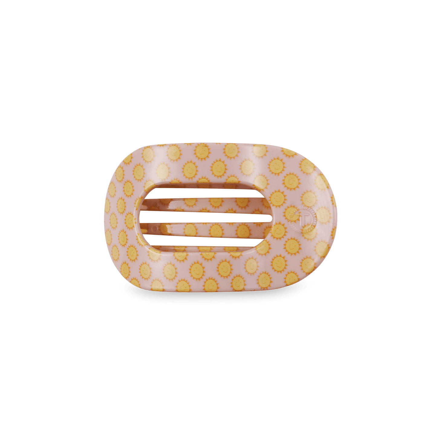 Lay flat and relax with the new TELETIES Sunny Days Ahead Small Flat Round Hair Clip in Yellow Pink. This hair clip is designed to allow you to lay back flat, do yoga, or sit comfortably in a seat with a headrest, and it is made with the same material that is nearly unbreakable.