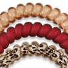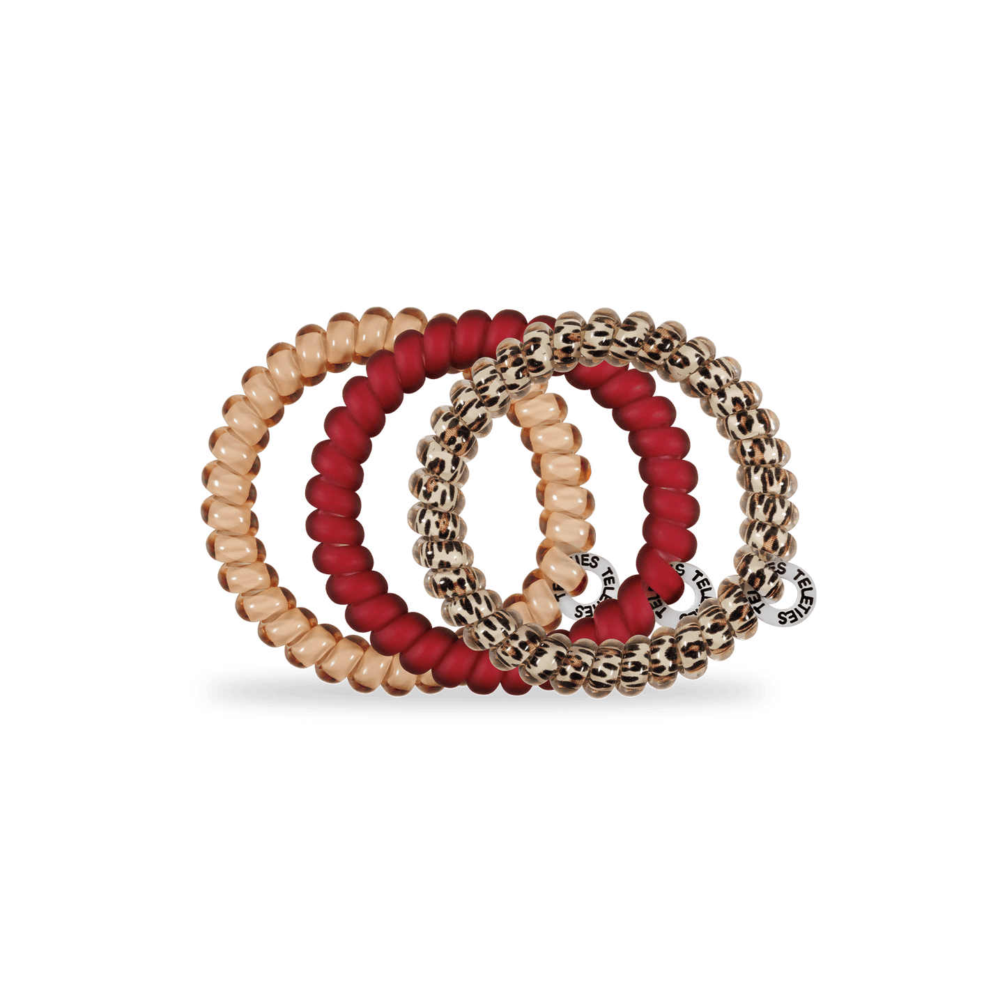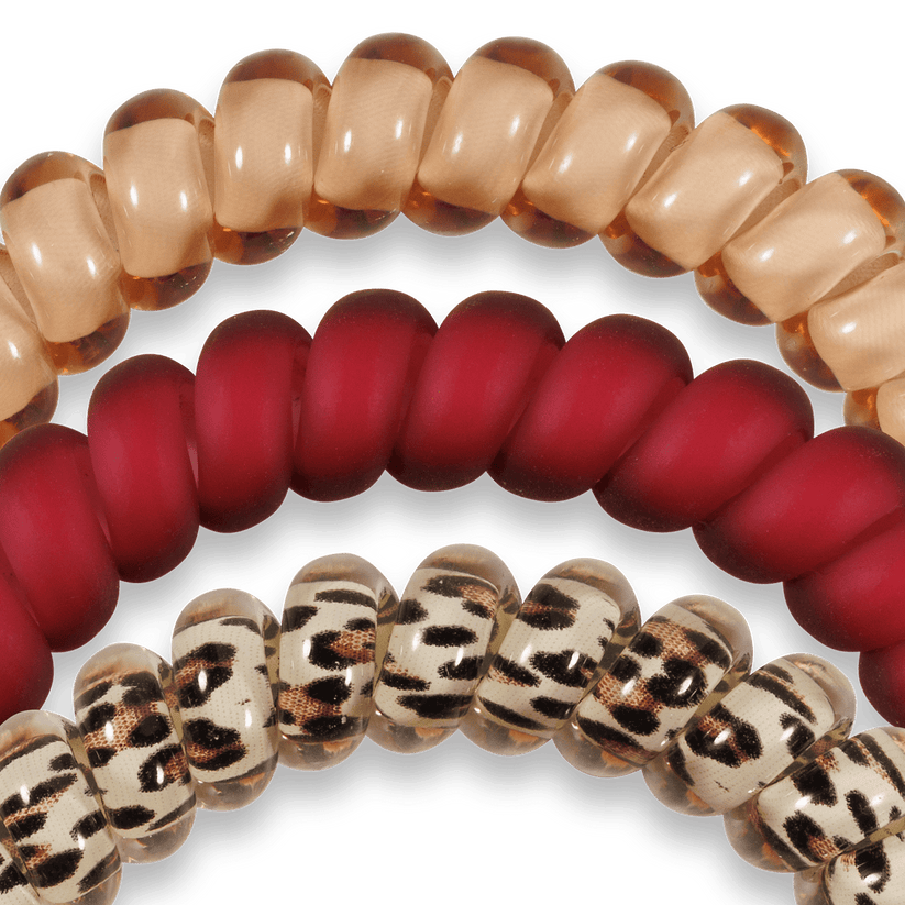 Wild Side Small Hair Ties in Burgundy and Beige offer a strong grip without damage, doubling as a chic wrist accessory when not in use. Your new favorite hair essentials all year round.